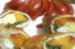 Se bat bine fileurile,cat mai intinse si se presara pe ele sare si piper. Pe fiecare fileu se intind,pe lung ca o fasie,intr-o parte,spanacul,morcovul fasii,oul fiert unul langa celalalt,fasii de gogosar. Se ruleaza fileurile cu atentie,iar ca sa nu iasa compozitia,pe lateral...